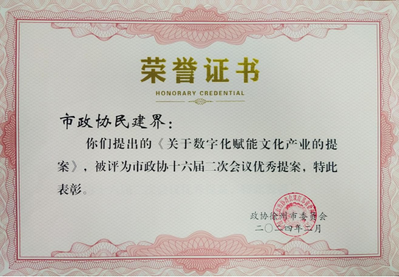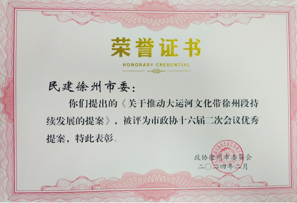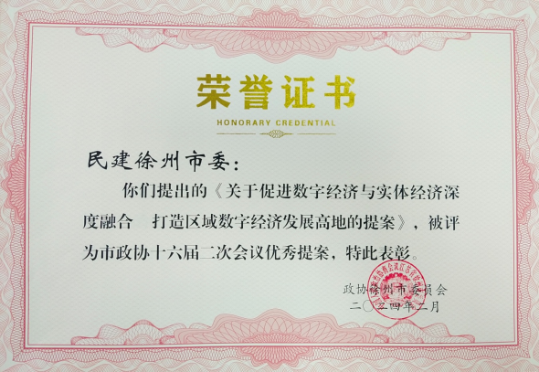 民建市委會3件集體提案——《關(guān)于促進數(shù)字經(jīng)濟與實體經(jīng)濟深度融合,打造區(qū)域數(shù)字經(jīng)濟發(fā)展高地的提案》(第1002號)、《關(guān)于推動大運河文化帶徐州段持續(xù)發(fā)展的提案》(第3002號)、《關(guān)于數(shù)字化賦能文化產(chǎn)業(yè)的提案》(第3016號)被表彰為“政協(xié)徐州市第十六屆委員會第二次會議優(yōu)秀提案”。