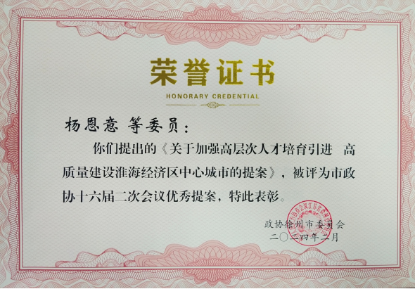 市政協(xié)常委、民建市委會副主委康建榮等提交的《關(guān)于發(fā)揮綜合交通樞紐功能,助推徐州經(jīng)濟社會高質(zhì)量發(fā)展的提案》(第1001號),市政協(xié)委員、民建市委會經(jīng)開區(qū)總支部主委徐磊和市政協(xié)委員、民建市委會云龍區(qū)基層委員會一支部主委楊恩意等提交的《關(guān)于加強高層次人才培育引進,高質(zhì)量建設(shè)淮海經(jīng)濟區(qū)中心城市的提案》(第2001號),市政協(xié)委員、民建市委會機關(guān)二支部會員王興博提交的《關(guān)于積極應對人口老齡化,聚焦“老有頤養(yǎng)”,打造高質(zhì)量養(yǎng)老護理體系的提案》(第4064號)等3件委員個人提案被表彰為“政協(xié)徐州市第十六屆委員會第二次會議優(yōu)秀提案”。