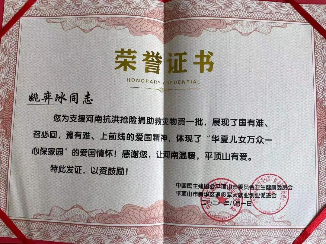 但姚弈冰并未就此放棄,又多方面、多渠道了解災(zāi)區(qū)需求,恰巧看到“助力防汛救災(zāi) 民建人在行動”的報道,了解到平頂山受災(zāi)嚴重,正需要物資和捐助,她根據(jù)有關(guān)信息資料想方設(shè)法主動聯(lián)系,最終與民建平頂山市委衛(wèi)生健康委員會和平頂山市新華區(qū)退役軍人就業(yè)創(chuàng)業(yè)促進會進行了具體溝通對接,反復(fù)蹉商,確定了捐贈方案。但綜合考慮到疫情期間的特殊情況,姚弈冰只好放棄親自前往的計劃,由物流專車將抽紙、蠶絲被、毛巾等價值6萬元的生活物資及現(xiàn)金1萬元送到災(zāi)區(qū)人民的手中。
