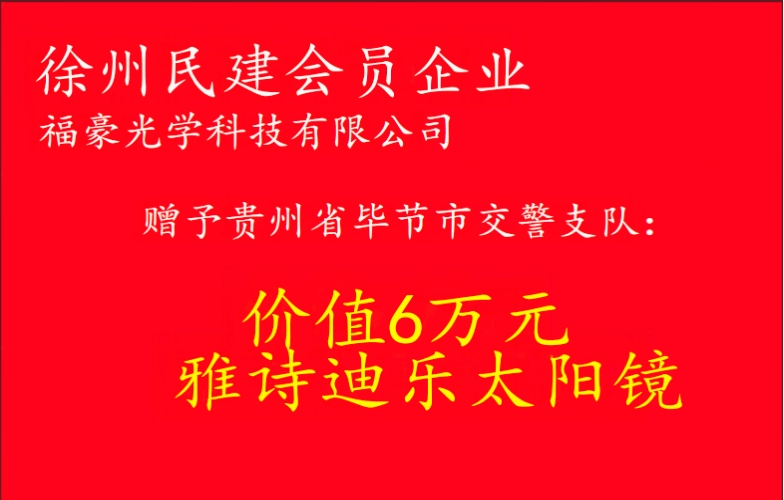 5月中旬在接到定向幫扶畢節地區相關倡議后,徐州民建會員、徐州福豪光學科技有限公司總經理趙建軍積極響應,慷慨解囊,無私奉獻,決定定向贈予貴州省畢節市交警執法人員男款太陽鏡100副、女款太陽鏡50副,價值6萬余元。近日在民建徐州市委會企委會活動中心舉行了捐贈交接儀式。民建徐州市委會副主委戴道路和部分企委會成員參加活動,會機關朱遠代表民建徐州市委會辦公室接收趙建軍會員捐贈的物品,隨后按照指定方式將捐贈物品郵寄至貴州省畢節市交警支隊。