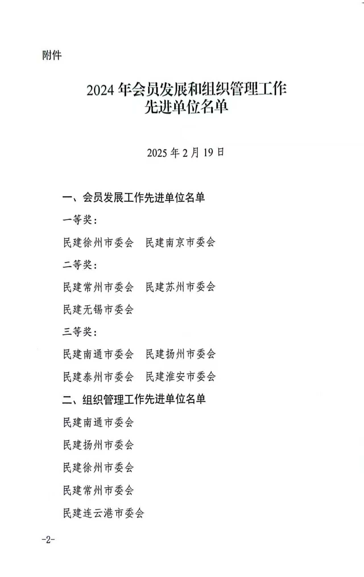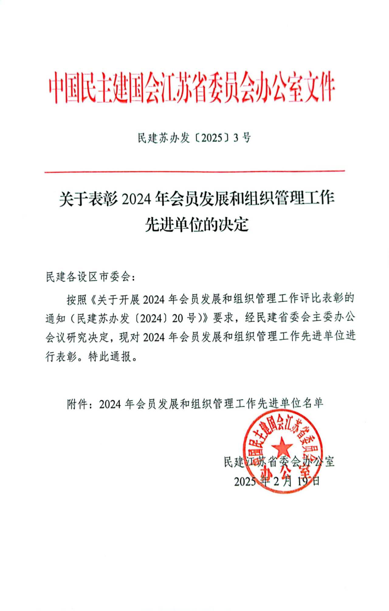 根據民建江蘇省委會辦公室印發的《關于表彰2024年度會員發展和組織管理工作先進單位的決定》(民建蘇辦發〔2025〕3號),民建徐州市委會榮獲全省民建2024年度會員發展工作一等獎和2024年度組織管理工作先進單位。