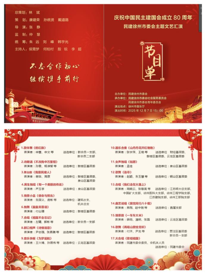 12 月 7 日,民建徐州市委會慶祝中國民主建國會成立 80 周年文藝匯演在徐州音樂廳隆重舉行。民建江蘇省委會副主委、徐州市副市長、民建徐州市委會主委林斌,徐州市人大常委會原副主任、民建徐州市委會原主委李君超,民建徐州市委會副主委康建榮、孫統賢、戴道路以及各位老領導等出席活動,中共徐州市委統戰部常務副部長于洪亮,徐州廣播電視傳媒集團黨委書記、臺長馮仰琦,徐州各相關高校黨委統戰部領導、各區黨委統戰部領導等應邀出席活動。徐州民建全體會員、會友和受邀代表 700 余人歡聚一堂,回顧多黨合作光輝歷程,共繪未來發展美好藍圖。