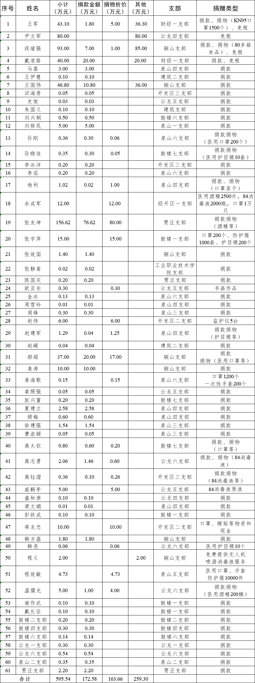 根據基層組織上報統計,截至2月29日,鼓樓二支部、四支部、六支部,云龍一支部、六支部,泉山二支部,賈汪支部7個基層組織以支部名義,其余會員以個人或公司名義向社會捐款捐物共計595.54萬元,其中:捐款172.58萬元、捐物價值163.66萬元,會員王軍、尹文軍、段緒強、戴道路等向租戶減免經營場地租金計259.3萬元。