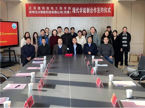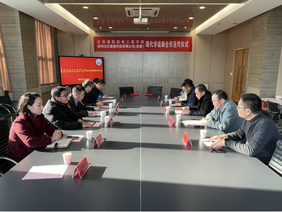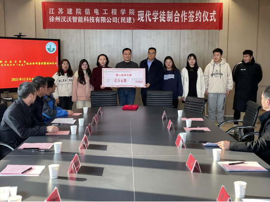 簽約儀式上,劉海波副校長代表學校致賀詞;信電工程學院院長吳兆立與徐州漢沃智能科技有限公司總經理張龍代表雙方簽署了現代學徒制人才培養協議;民建會友張龍總經理通過民建江蘇建院支部向信電工程學院少數民族學生捐增助學金10000元,并提供勤工助學崗位。