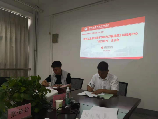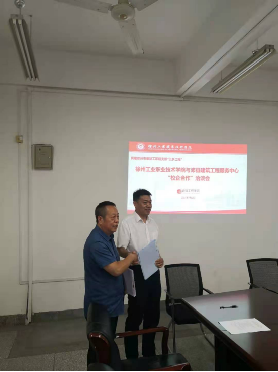 徐州工業職業技術學院黨委書記徐勇,統戰部部長朱偉軍,徐州工業職業技術學院建筑工程學院院長程建偉,黨支部書記、副院長張妍妍,徐州工業職業技術學院信息工程學院副院長楊勇,沛縣建筑工程服務中心主任王培,民建市委工職院支部主委張敬齋,江蘇大漢建設事業集團有限責任公司副總經理楊艷,江蘇帝邦建設工程有限公司書記高興禮,徐州漢源建設集團有限公司總經理張良等參會。會議由建筑學院院長程建偉主持。